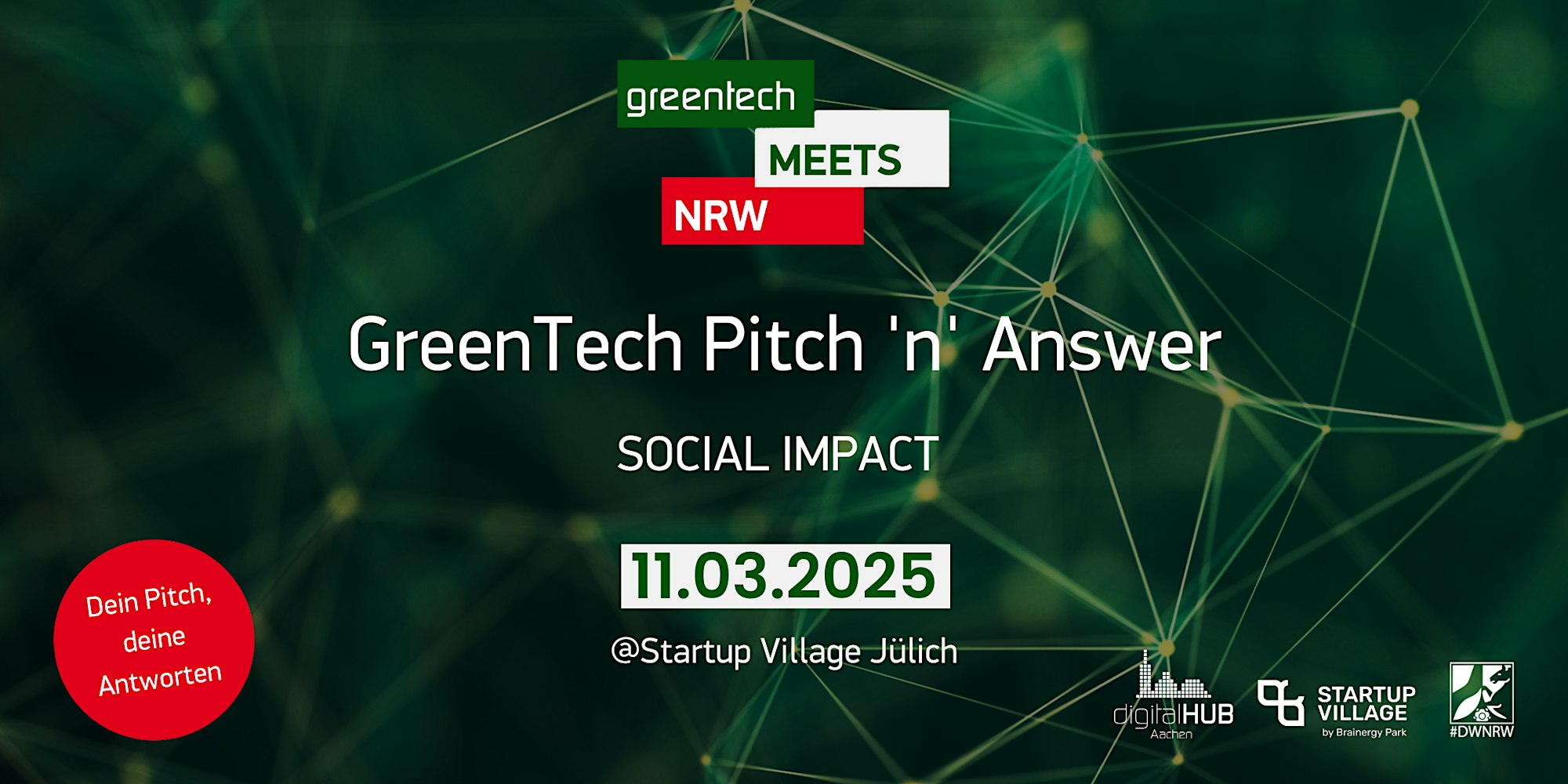 Pitches mit Social Impact und aktuellen Herausforderungen - helfe bei der Lösung mit und gebe dein Feedback ab! Das GreenTech Pitch 'n' Answer Format bringt die wichtigsten Akteur:innen der Szene zusammen – Startups, etablierte Unternehmen, Impact-Investoren und Hochschulen –, um gemeinsam an Lösungen für aktuelle Herausforderungen zu arbeiten. Im Fokus steht der zentrale Themenbereich "Social […]