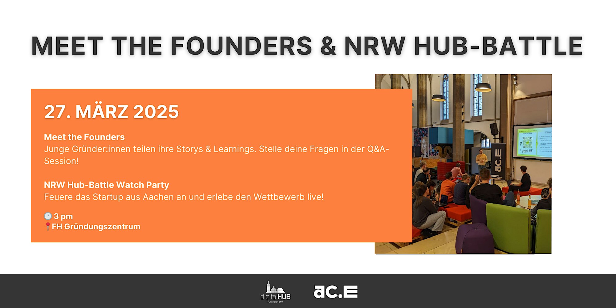 Triff erfolgreiche Gründer:innen, stell ihnen deine Fragen und feuere im Anschluss das Aachener Team beim NRW Hub-Battle an! Meet the Founders x NRW Hub-Battle – Zwei Events, ein Abend! Am 27. März 2025 erwartet euch ein Abend voller Inspiration, Networking und Startup-Action! 🔥 Meet the Founders – Erlebt die Stories und Learnings mehrerer Gründer:innen hautnah. […]