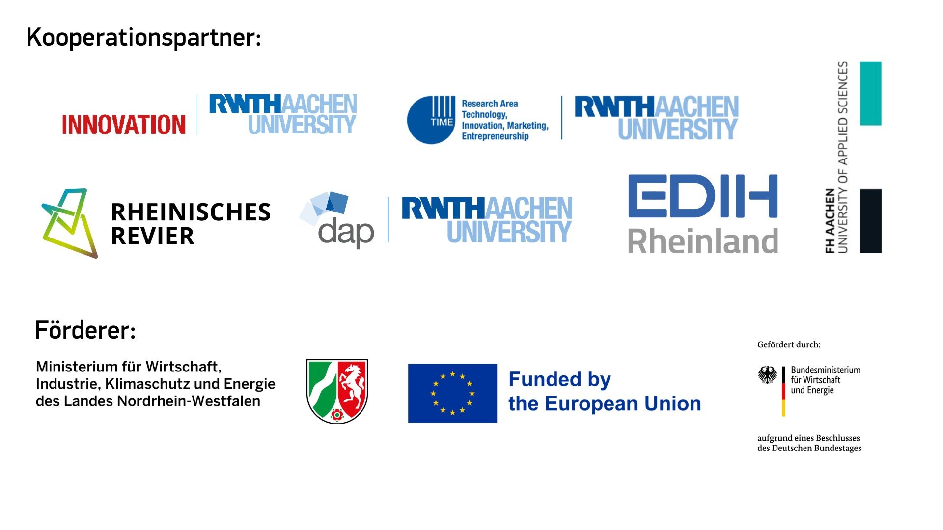 Unser Incubation Program wird in enger Zusammenarbeit mit dem European Digital Innovation Hub Rheinland (EDIH), der FH Aachen, der RWTH Innovation, dem Lehrstuhl TIME RWTH, dem Lehrstuhl DAP RWTH und dem Rheinischen Revier realisiert und wird vom Ministerium für Wirtschaft, Innovation, Klimaschutz und Energie des Landes NRW und der Europäischen Union sowie dem Bundesministerium für Wirtschaft und Energie gefördert.