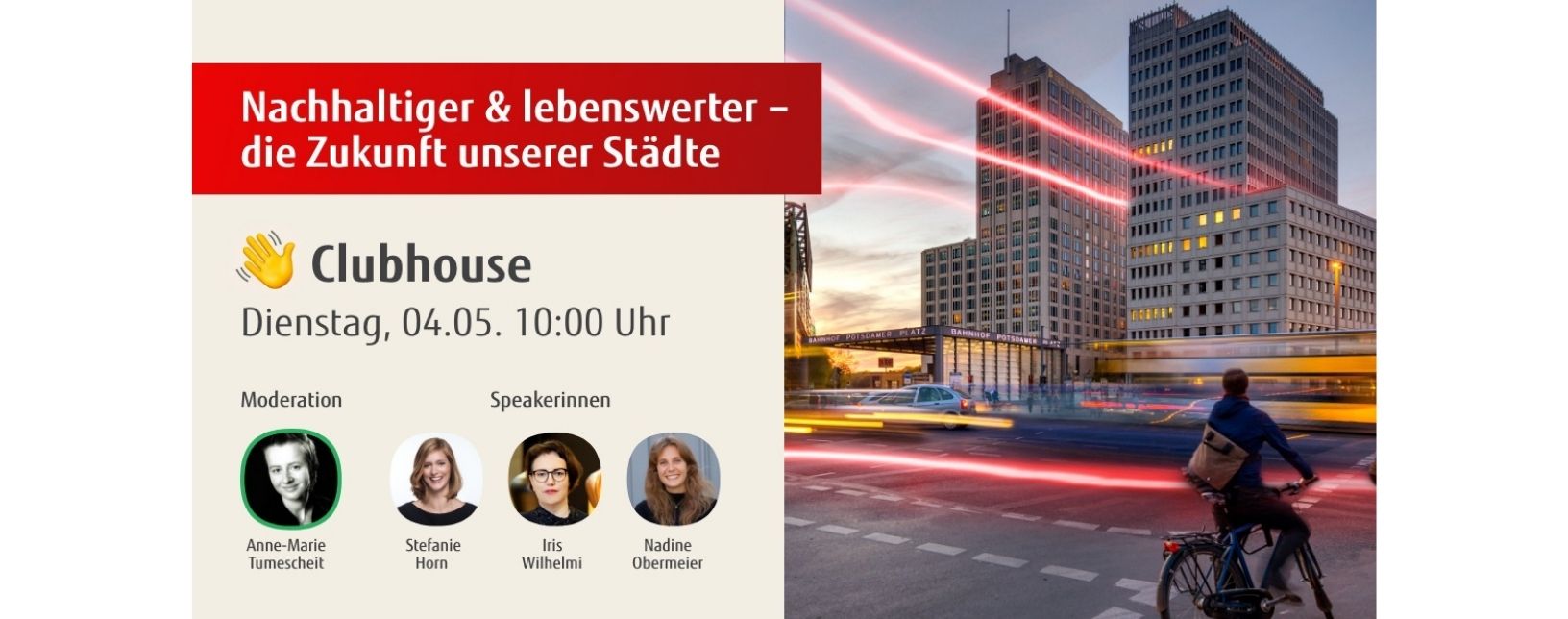 Nachhaltigkeit und der Klimawandel – das geht nicht nur Berliner:innen besonders an! Zusammen mit Iris Wilhelmi vom digitalHUB Aachen e.V., Nadine Obermeier vom MotionLab.Berlin sowie Stefanie Horn von Fujitsu und moderiert von Anne-Marie Tumescheit wird dieses wichtige Thema in einer Clubhouse Session durch die Smart City Brille betrachtet. Wir setzen auf eine bunten Blumenstrauß an Impulsen und freuen uns schon riesig auf den sicher wieder inspirierenden Austausch. Sie sind herzlich im Clubhouse willkommen – egal ob als Zuhörer:in oder Diskutant:in.