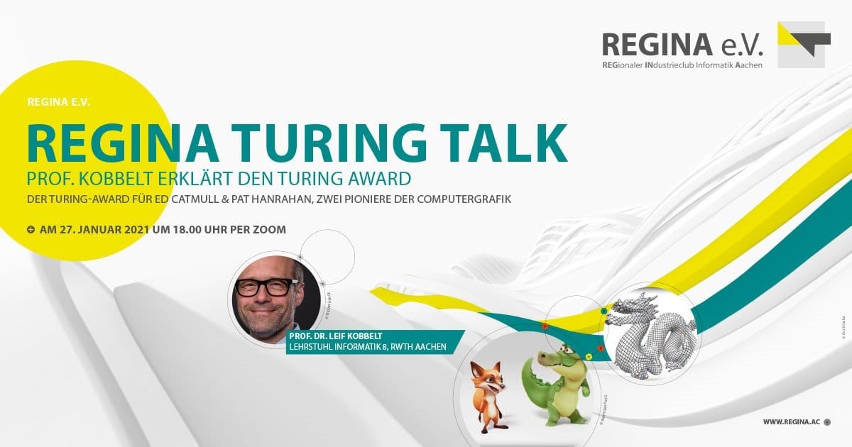 Der Turing-Award ist die höchste wissenschaftliche Auszeichnung in der Informatik, durchaus vergleichbar mit den Nobelpreisen in den Natur- und Wirtschaftswissenschaften. Er ist nach dem britischen Computer-Pionier Alan M. Turing benannt und wird seit 1966 (jeweils im Folgejahr) verliehen. Um die mit dem Preis ausgezeichneten Errungenschaften aus der Informatik einem breiteren Publikum näherzubringen, startet der Regina e.V. in diesem Jahr ein neues Format, den “Turing-Talk”. Darin präsentiert eine Persönlichkeit aus dem Fachgebiet der aktuellen Turing-Award-Gewinner die mit dem Preis ausgezeichneten Leistungen und Ergebnisse. Den Anfang macht Prof. Leif Kobbelt, RWTH Aachen, der die beiden Computergrafik-Pioniere Ed Catmull und Pat Hanrahan vorstellt, die im Frühjahr 2020 den Turing Award 2019 erhielten.