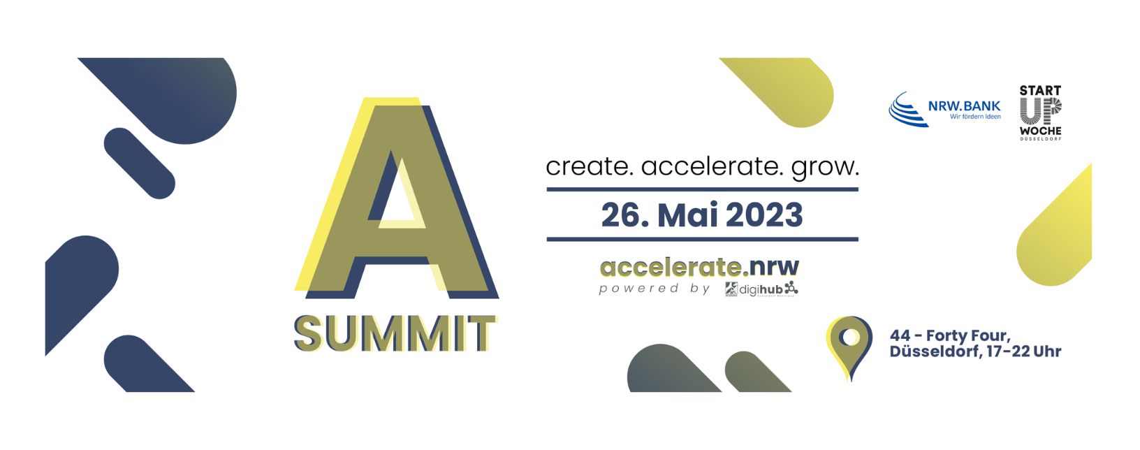 Im Rahmen der Startup-Woche Düsseldorf wird am 26. Mai 2023 zum sechsten Mal der Accelerator-Summit, kurz A-Summit, veranstaltet. Dort kommen über 40 Start-up-Förderprogramme aus NRW zusammen. Gründer:innen und Gründungsinteressierte treffen beim Event auf Ansprechpartner:innen und Expert:innen rund um die Themen Start-up-Förderung und -Finanzierung.