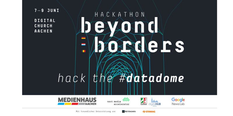 Medienhaus Aachen hosts the euregional hackathon „Beyond Borders – Hack the #datadome“ from Thursday, 7th to Saturday, 9th June 2018. The event around Open Data takes place in cooperation with the digitalHUB Aachen, the next media accelerator (nma) from Hamburg and the Google News Lab.The event is supported by NetAachen and the STAWAG.