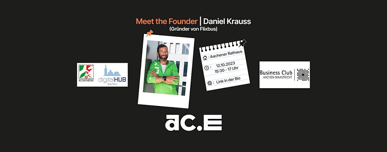 Den Auftakt dieser neuen Reihe macht Daniel Krauss von Flixbus. Daniel Krauss kommt im Rahmen des Unternehmerpreises nach Aachen, um die Laudatio für Susanne Klatten (BMW Großaktionärin) zu halten. Freut euch also auf eine spannende Q&A Runde mit Daniel Krauss im Krönungssaal der Stadt Aachen.