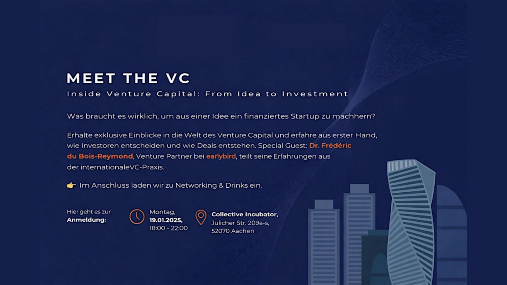 Bei Meet the VC bietet euch AC.E Aachener Entrepreneurship Team exklusive Einblicke in die Welt des Venture Capitals und zeigt aus erster Hand, wie Investoren entscheiden und wie Deals entstehen. In entspannter Atmosphäre erhaltet ihr einen realistischen Blick hinter die Kulissen von Venture Capital – von frühen Ideen über Investmentprozesse bis hin zu den Faktoren, die für Investoren wirklich zählen.