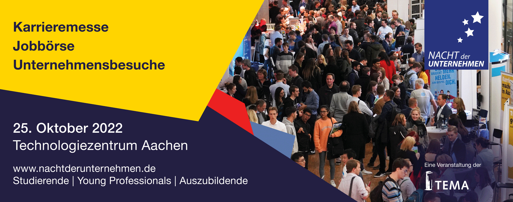 Die NACHT DER UNTERNEHMEN öffnet auch dieses Jahr die Tore und lädt zum Netzwerken ein. Seid dabei, nutzt die Chance zum Recruiting und katapultiert euer Unternehmen auf die nächste Erfolgsstufe – mit neuen Fachkräften! Es ist wieder Zeit für neue Arbeitskräfte, neue Chancen, für Recruiting und Bonding! Auf der NACHT DER UNTERNEHMEN treffen Fachkräfte, Berufseinsteiger, Hochschulabsolventen, interessierte Studierende, Schüler:innen, jobsuchende Azubis, Abiturienten und young Professionals auf Unternehmen aus der Region. Die Interessenten kommen aus den Bereichen des Ingenieurwesens, der Betriebswirtschaft, der Naturwissenschaften, der Informatik sowie der Geistes- und Sozialwissenschaften. Die NACHT DER UNTERNEHMEN bietet Informationen, Kontakte und Gesprächsmöglichkeiten mit potenziellen Arbeitgebern. Veranstaltungsort wird das Technologiezentrum in Aachen sein.