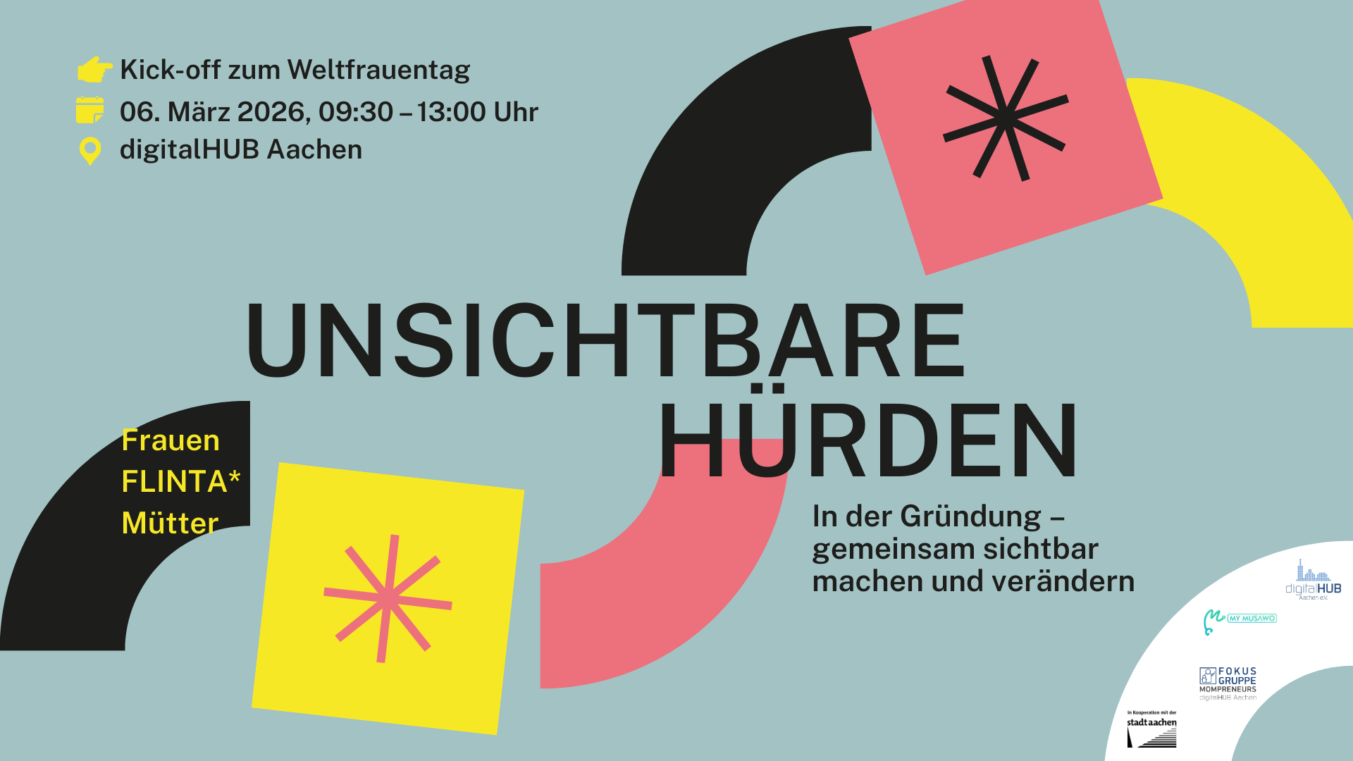 „Unsichtbare Hürden“ ist ein interaktives Event für Frauen, Mütter & FLINTA* – egal ob du bereits gegründet hast oder gerade erst mit dem Gedanken spielst. Zusammen mit der Stadt Aachen schaffen wir einen Safe Space, um Erfahrungen zu teilen, strukturelle Barrieren sichtbar zu machen und konkrete Forderungen & Veränderungsvorschläge für das Startup-Ökosystem zu entwickeln.