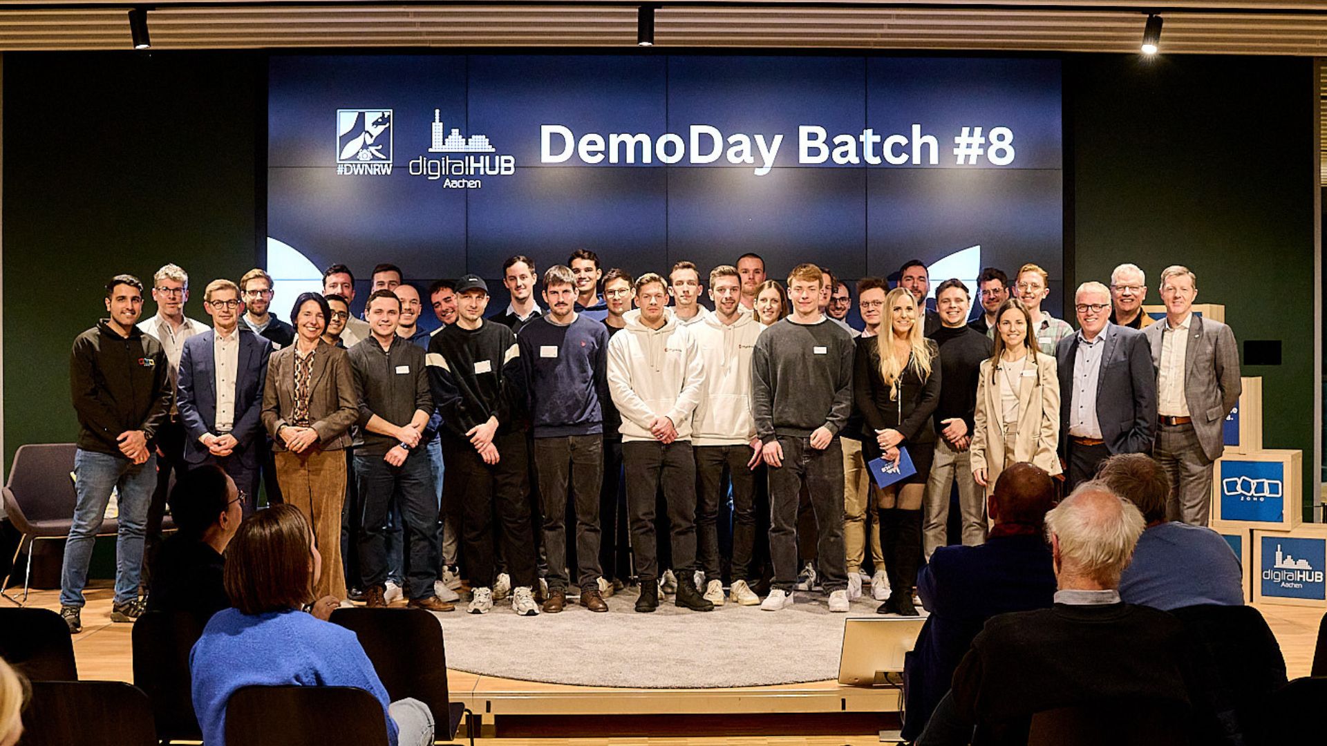 Gestern Abend erlebte das Mediahuis Aachen eine besondere Premiere: Zehn innovative Startups präsentierten ihre zukunftsweisenden Geschäftsideen vor einem begeisterten Publikum. Der DemoDay fand erstmals im Mediahuis Aachen statt, um den Startup-Teams einen direkten Zugang zu Medienkontakten zu vermitteln. Er markiert den finalen Abschluss des digitalHUB-Inkubationsprogramms. In den vergangenen drei Monaten haben die Teams im digitalHUB ein intensives Förderprogramm bestehend aus Workshops, Beratung und Mentoring durchlaufen. Die Gründer:innen-Teams decken mit ihren digitalen Geschäftsmodellen eine große Bandbreite an Themen und Branchen ab wie zum Beispiel Energie, Gesundheit, Bildung, KI, Industrie und Nachhaltigkeit.