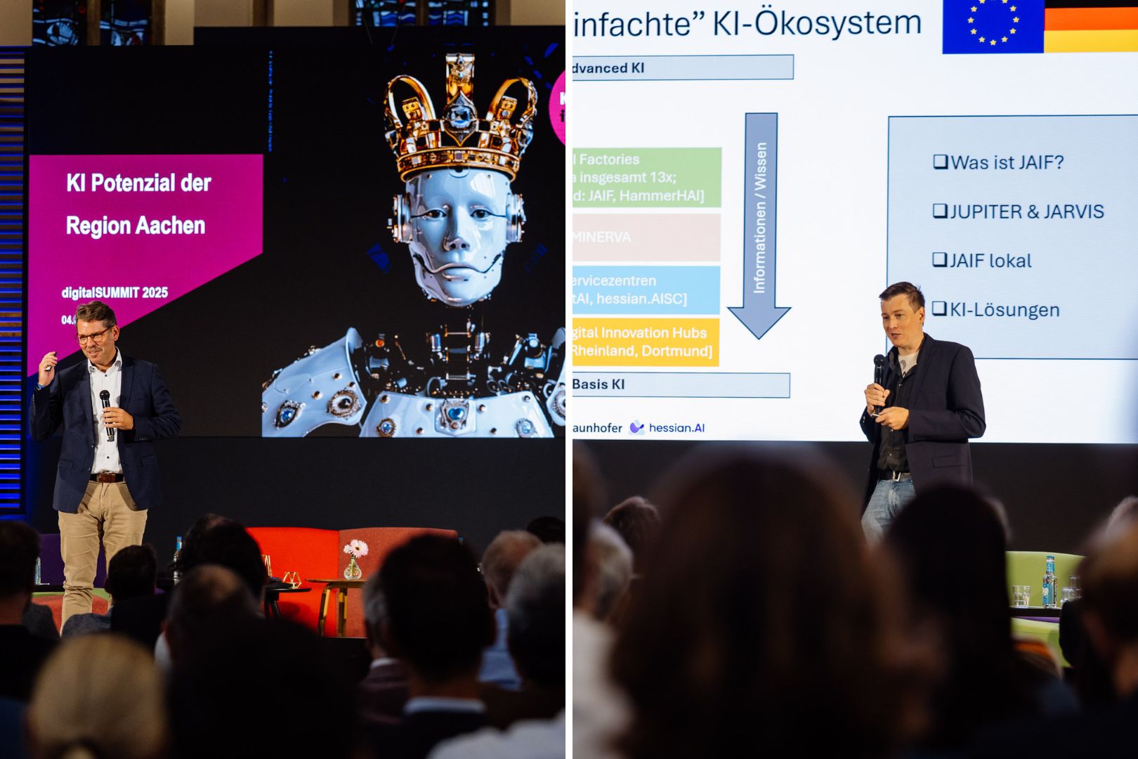 Ein Highlight war der Impuls zur JUPITER AI Factory, dem europaweit ersten Supercomputer der Exascale-Klasse, der in Jülich entsteht. „Mit JUPITER wird Aachen/Jülich zum Herzstück der europäischen KI-Infrastruktur – und Startups sowie Unternehmen aus der Region erhalten Zugang zu einmaliger Rechenpower“, erklärten Thomas Hissel (Beigeordneter Stadt Aachen) und Mathis Bode (Forschungszentrum Jülich). Anschließend verwies auch Wil Houben, Wirtschaftsdezernent der Stadt Heerlen, auf die Chancen einer grenzüberschreitenden Zusammenarbeit im Dreiländereck.