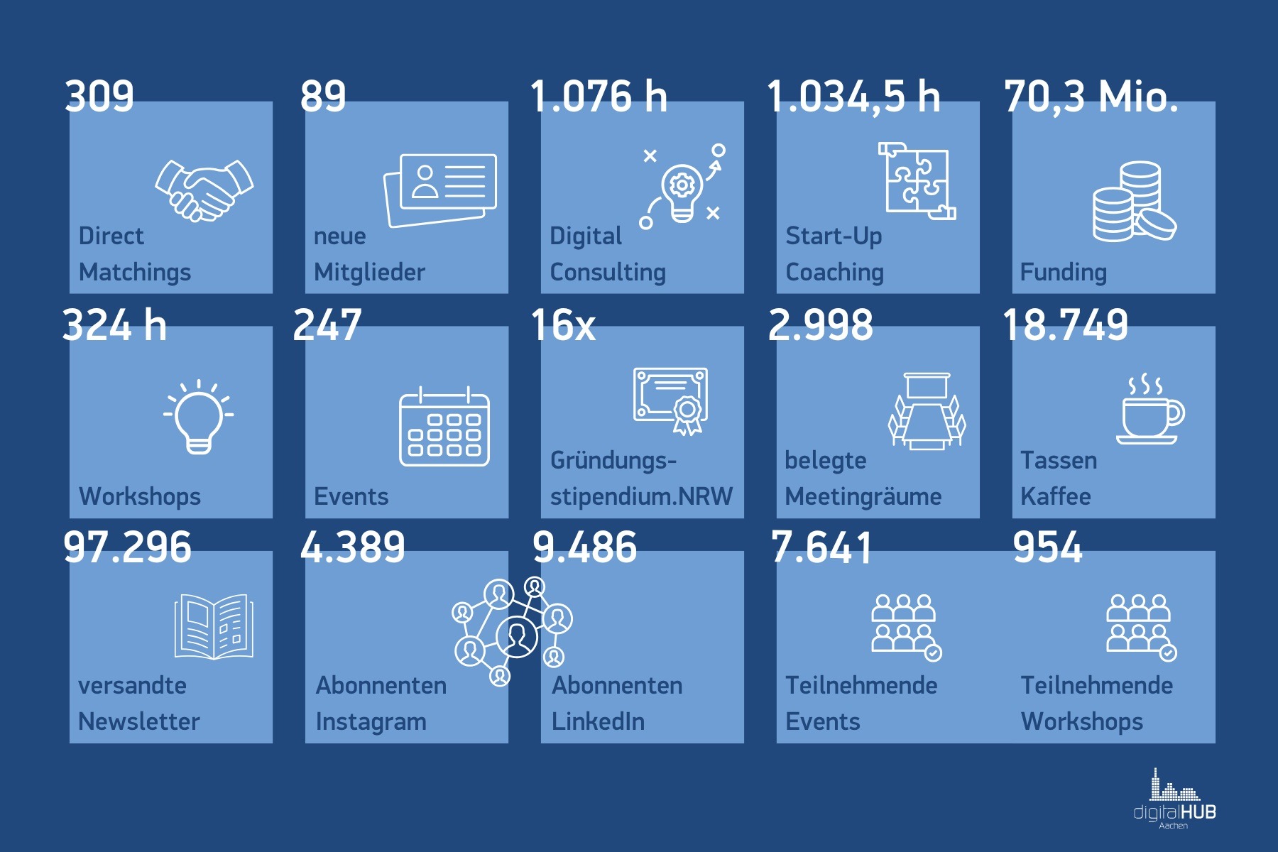 12 Monate, 365 Tage, 8.760 Stunden: Das ist das Jahr 2024 in Zahlen. Seit Beginn des Jahres konnten wir 89 neue Mitglieder gewinnen. Der digitalHUB hat 247 Events mit 7.641 Teilnehmer:innen (co-)veranstaltet und 309 Direkt-Matchings initiiert. Insgesamt haben 1.034,5 Stunden Startup-Coaching, 1.076 Stunden Digital Consulting und 324 Stunden Workshops stattgefunden. Ganze 70,3 Mio. Euro Funding haben unsere Startups in diesem Jahr erhalten! Und eine letzte wichtige Zahl möchten wir euch auf keinen Fall vorenthalten: Im digitalHUB wurden im letzten Jahr rund 18.749 Tassen Kaffee getrunken…