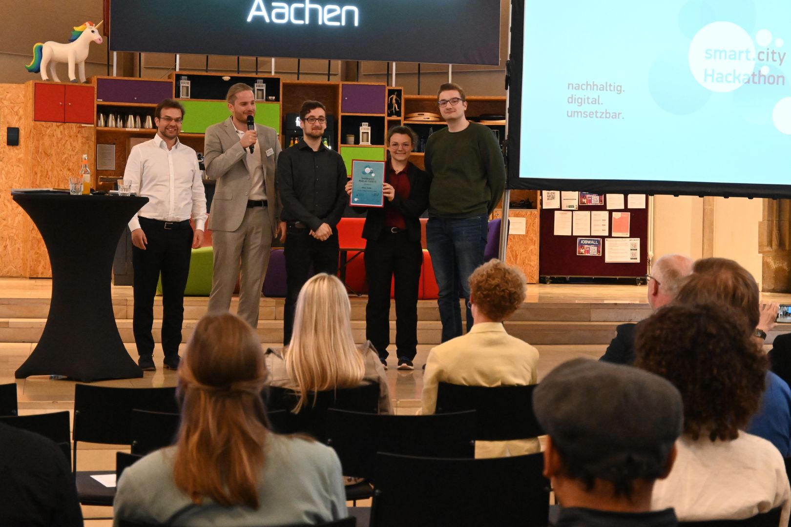 Am Sonntag, 18. Mai, präsentierten die Teams ihre Ergebnisse vor einer Jury aus Expert*innen aus Verwaltung, Wissenschaft und Wirtschaft. Vergeben wurden Preisgelder in Höhe von insgesamt 8.500 Euro, darunter drei Sonderpreise. Den ersten Preis erhielt das Team von Noise Aware, dass sich mit Umgebungslärm und dessen Vermeidung in der Stadt beschäftigt hat. Das Team erhielt außerdem den Sonderpreis der Firma MathWorks und hatte die Gelegenheit, ihr Projekt am 19. Mai im Rahmen der Eröffnungszeremonie der KI-Woche, die vom KI-Center der RWTH ins Leben gerufen wurde, im Ludwig Forum zu präsentieren. Zudem erhielt die mit elf Jahren jüngste Teilnehmerin den „Sonderpreis für die kreativste Idee“. Sie und ihr Vater planten einen Smart Park, samt intelligenter und stromerzeugender Spielgeräte.