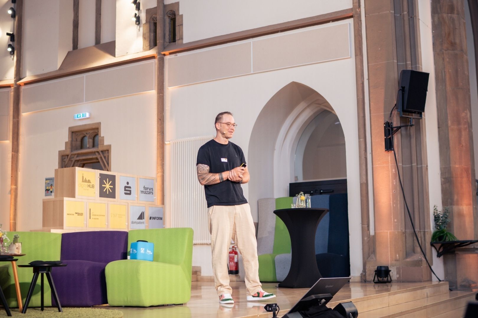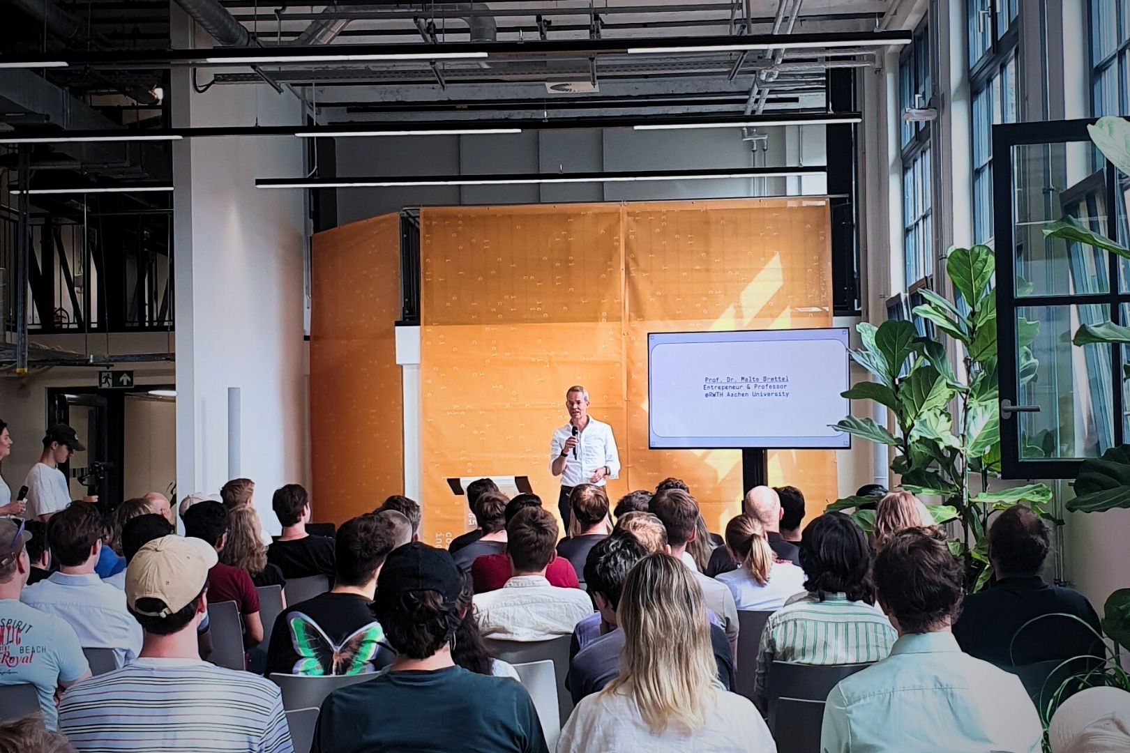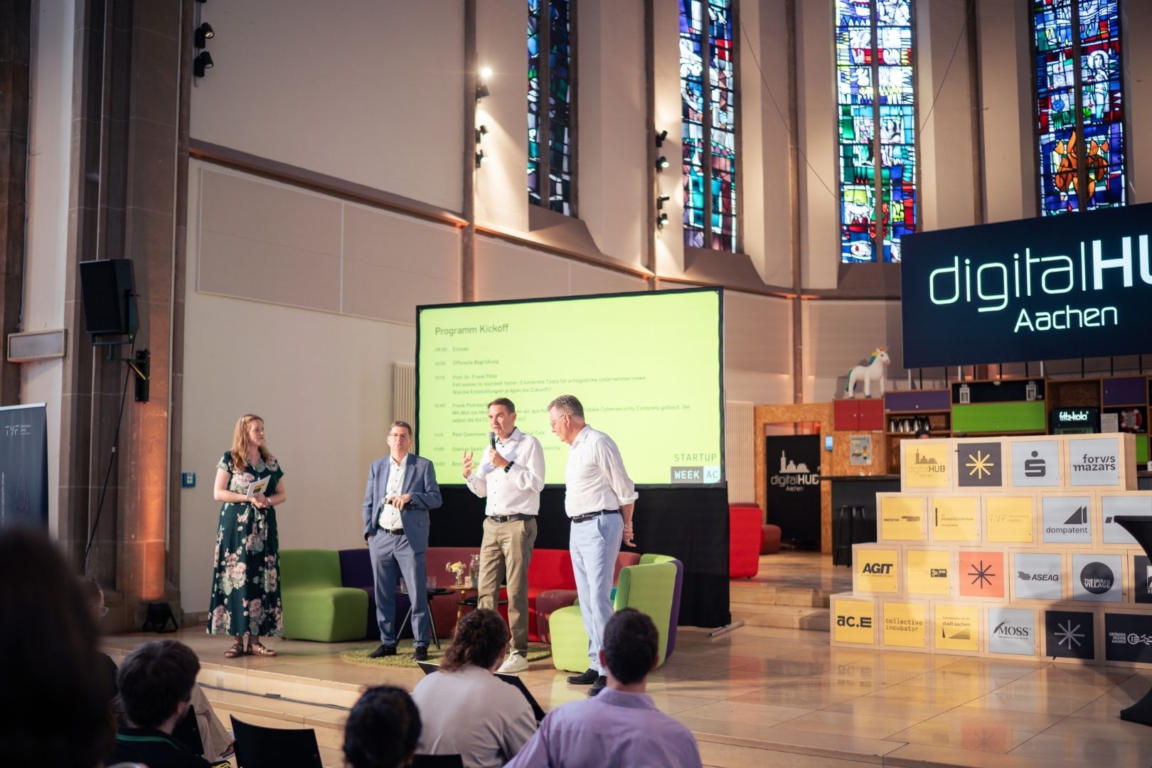 Den offiziellen Auftakt bildete das Welcome Event im digitalHUB Aachen. Rund 150 Teilnehmende wurden von Prof. Matthias Wessling (RWTH), Prof. Thomas Ritz (FH Aachen) und Dr. Oliver Grün (digitalHUB) begrüßt. Prof. Frank Piller gab in einem Impuls konkrete Werkzeuge für Gründer:innen mit auf den Weg, bevor Frank Piotraschke (SoSafe) in seiner Keynote vom Weg zum internationalen Cybersecurity Player berichtete. Im Anschluss diskutierten Aachener Gründer:innen in einem offenen Talk über Herausforderungen und Erfolge.